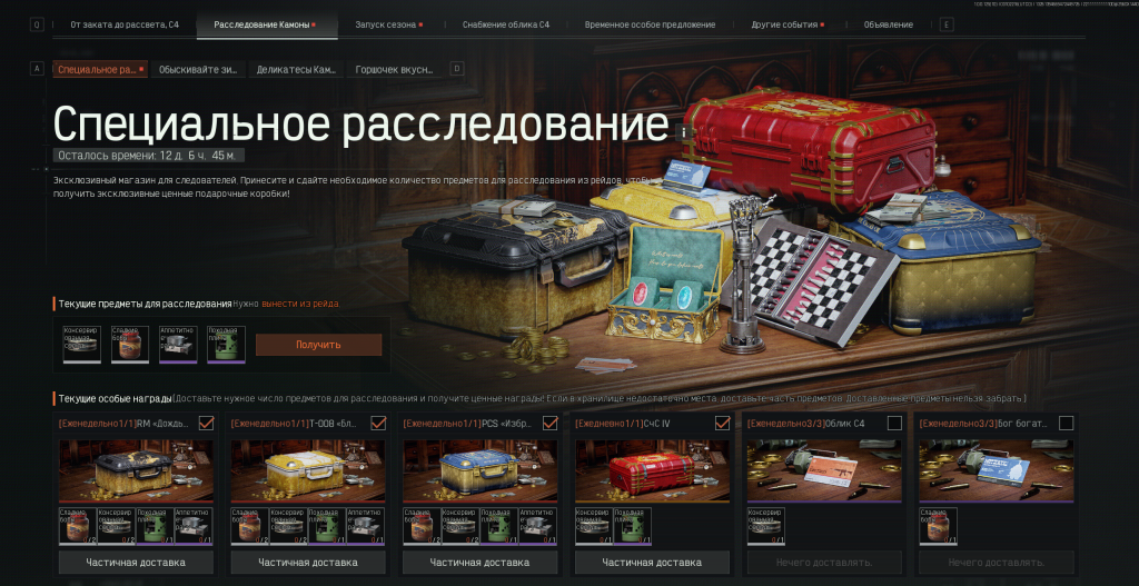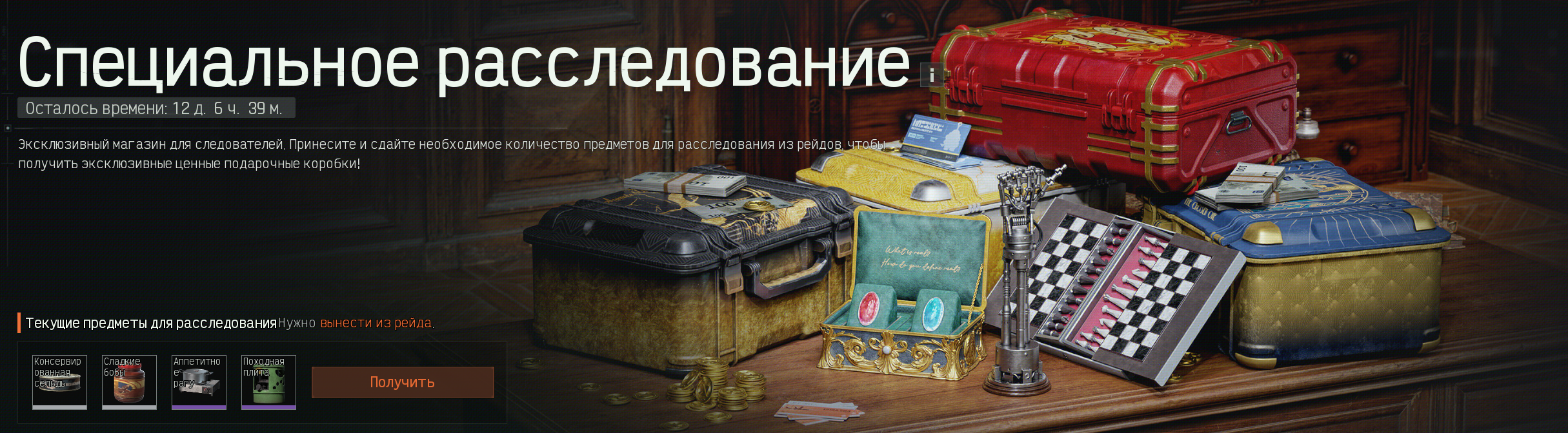 Эксклюзивный магазин для следователей. Принесите и сдайте необходимое количество предметов для расследования из рейдов, чтобы получить эксклюзивные ценные подарочные коробки!